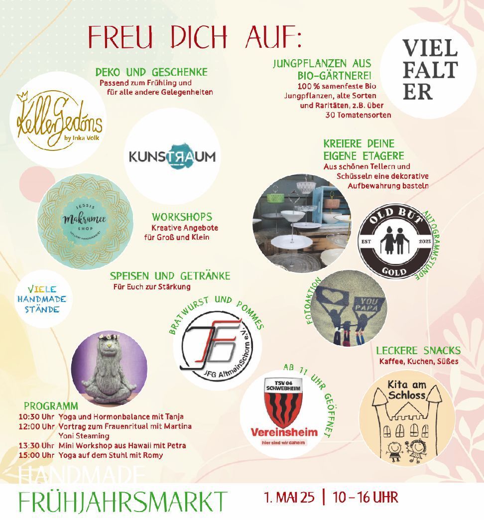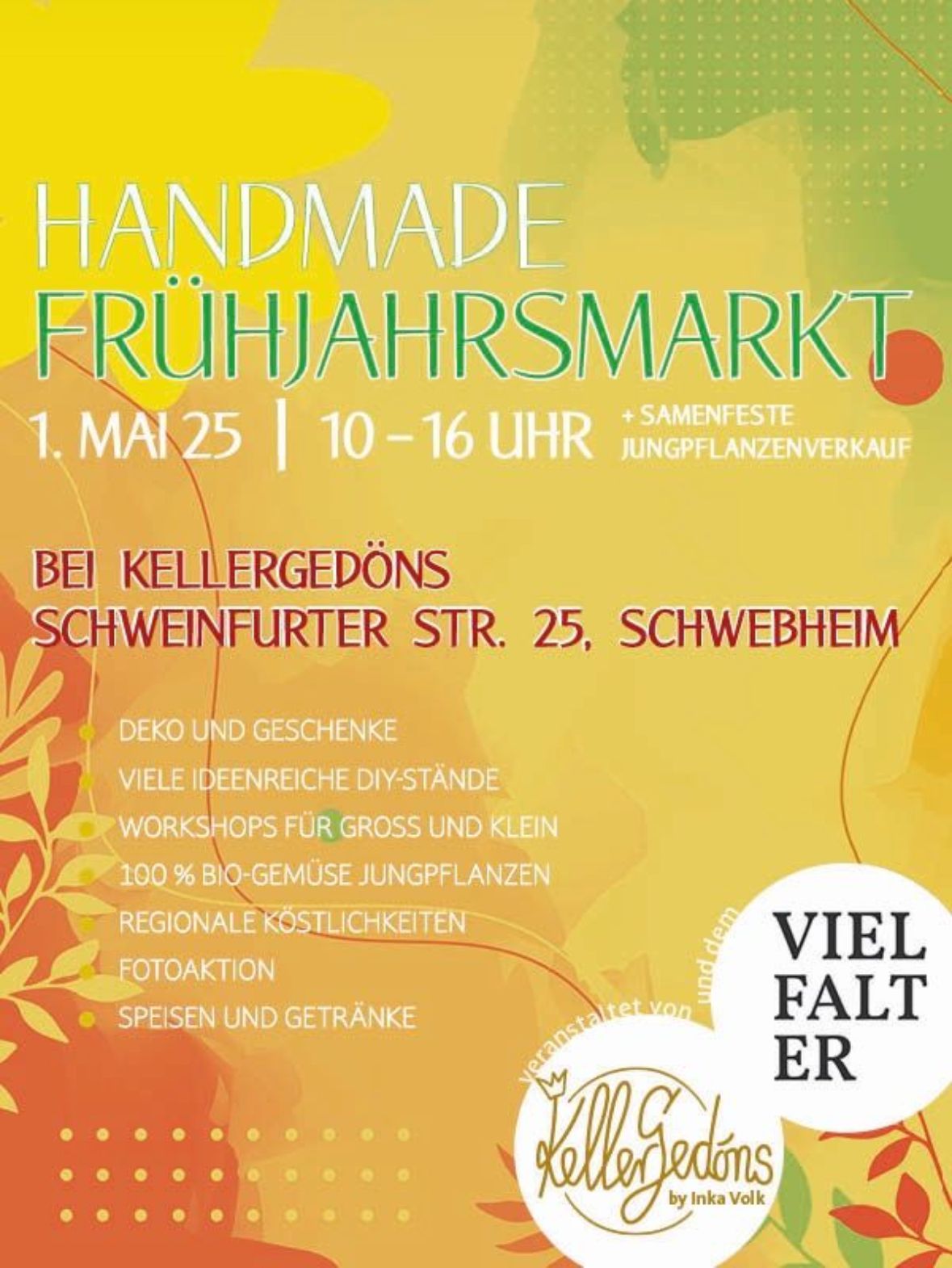 Am 1. Mai 2025 von 10-16 Uhr findet der Frühjahrsmarkt im Laden auf dem Gelände von Inkas KellerGedöns neben dem Sportplatz in Schwebheim statt. Es gibt viele schöne handgemachte Dinge zu kaufen, lecker Kaffee und Kuchen und wir sind mit einem Bratwurst und Pommes Stand vor Ort um unsere Vereinskasse aufzubessern. Lecker Bratwurst von Kulinario und Pommes mit Spezialgewürz. Kommt vorbei!